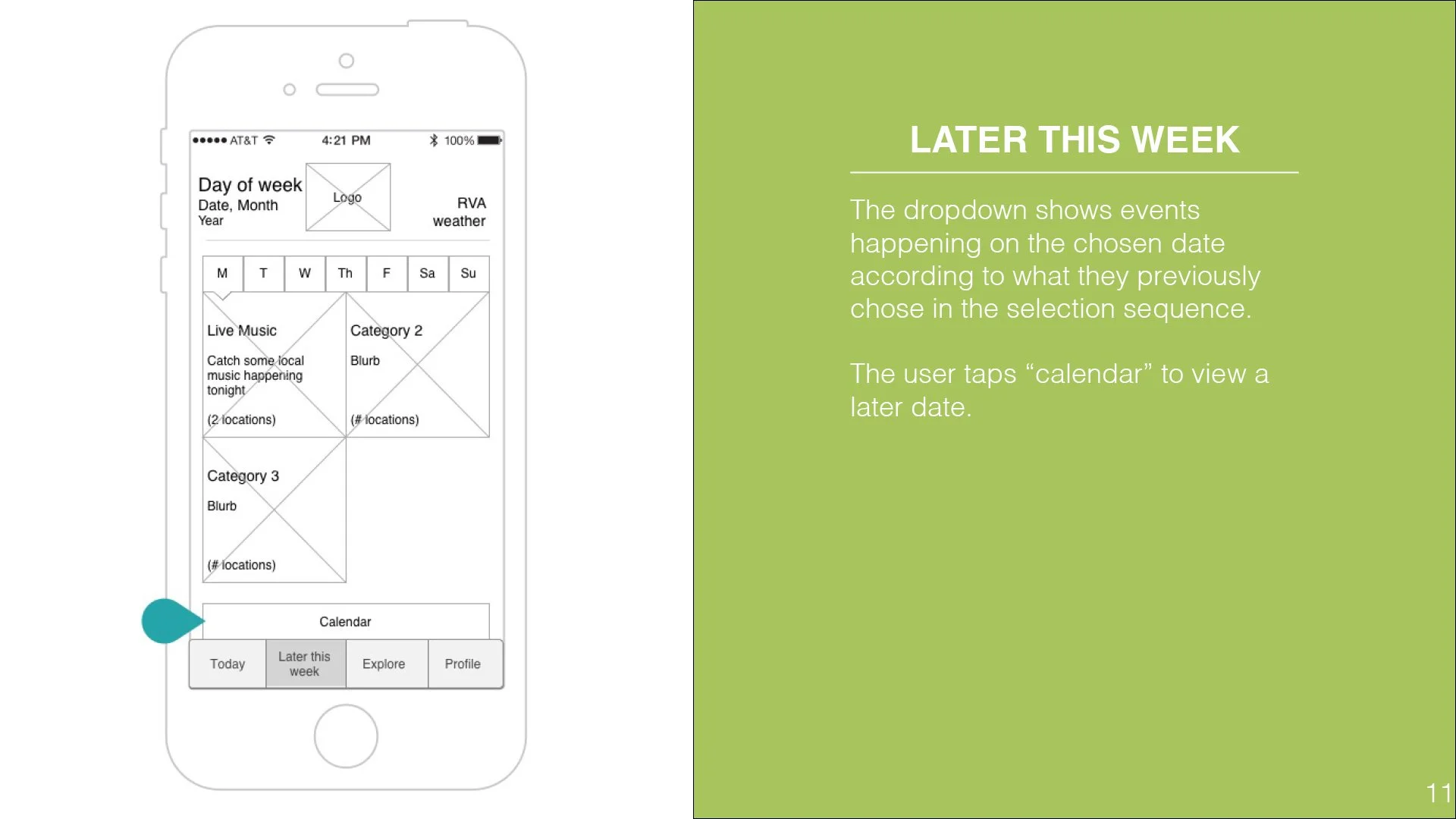 A user can browse activities happening that day based off their selections, or they can select a future date to browse events happening on that day, or they can explore a general list of activities that are organized according to type.